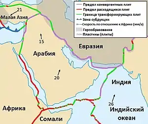 В течение фанерозоя (палеозоя — кайнозоя) Аравийская плита была частью Африканской плиты и до сих пор до конца не утратила с ней связь, так что иногда их рассматривают как составляющие единой Африкано-Аравийской платформы. Красное море появилось в начале эоцена, но отделение Африки от Аравии происходило в олигоцене, и с того времени Аравийская плита медленно смещается в направлении к Евразийской плите.