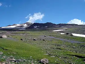 ![]() Арагац, вид с востока, слева направо видны вершины: Южная, Западная, Восточная, Северная. | |
