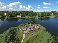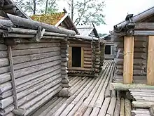 В исследованной части поселения нашли около 145 отдельных жилых и хозяйственных деревянных построек разных времён и остатки оборонительных конструкций. Поселение представляло собой комплекс сооружений на прямоугольном бревенчатом настиле. Застройка состояла из пяти рядов курных изб и хозяйственных помещений, четыре ряда которых располагались по периметру площадки, а пятый — в середине её. Между строениями пролегали улочки шириной от 1,5 до 3,5 м. Со всех сторон замок защищали бревенчатые стены. С берегом его соединяла насыпная дамба.