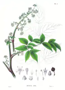 Сверху вниз: Ствол (Aralia rex). Листья и соцветия (Аралия кистистая). Соцветие (Аралия высокая). Семена (Аралия калифорнийская) |