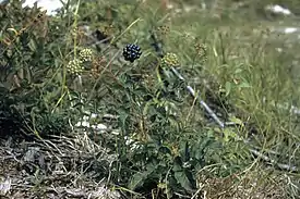 Плоды пурпурно-чёрные, почти шаровидные, диаметром 6—8 (до 10) мм.