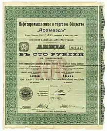 - Путеводитель по фондам РГИА/ФОНДЫ ОБЩЕСТВЕННЫХ И ЧАСТНЫХ УЧРЕЖДЕНИЙ И ОРГАНИЗАЦИЙ/Фонды акционерных обществ и товариществ/Нефтяные|Номер фонда:1435 | АКЦИОНЕРНОЕ НЕФТЕПРОМЫШЛЕННОЕ И ТОРГОВОЕ ОБЩЕСТВО «АРАМАЗД»
