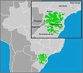 В XIX веке основной ареал араукарии находился в бразильских штатах Парана, Санта-Катарина и Риу-Гранди-ду-Сул. Кроме этого, встречается на юге штатов Минас-Жерайс и Рио-де-Жанейро, юго-востоке штата Сан-Паулу, а также в северо-восточных аргентинских провинциях Мисьонес и Корриентес и юго-восточном парагвайском департаменте Альто-Парана.