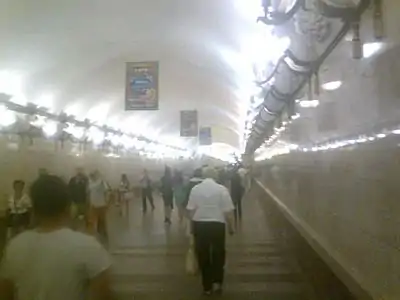 Центральный зал имеет огромную протяжённость, и в нём отсутствует замкнутая перспектива[9]. Пилоны отделаны внизу красным мрамором «салиэти» и украшены выполненными из керамики букетами цветов[1]. Пол выложен серым, красным и чёрным гранитом в виде коврового рисунка. Путевые стены облицованы глазурованной керамической плиткой, белой вверху и чёрной внизу. Станционный зал освещается подвесными двумя рядами люстр в золочёной бронзовой оправе, декорированных орнаментом[10]. Стены подходных коридоров облицованы серовато-белым пятнистым мрамором с цоколем из красного мрамора[10]. Возле каждого пилона со стороны бокового зала и со стороны центрального зала находятся скамейки.
