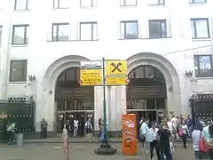 За входом расположены два коридора, созданные для движения пассажиропотоков. Здесь четыре двери в одной арке — на вход, а ещё четыре — на выход[16]. Между двумя коридорами находится небольшое помещение, в котором продаются авиа- и железнодорожные билеты, а также расположен аптечный киоск. За коридорами — кассовый зал. В стене напротив эскалаторного зала, где раньше осуществлялся вход-выход, находятся пост полиции и театральные кассы. Напротив них — кассы метрополитена. Кассовый зал разделяется на два коридора, которые ведут в эскалаторный зал[17].