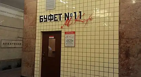 На платформе станции 28 декабря 2016 вновь открылся отреставрированный буфет № 11, обслуживаемый столовой № 9 Отдела рабочего снабжения Московского метрополитена. Большинство буфетов и столовых Отдела рабочего снабжения обслуживает только работников метро, но есть три исключения: помимо «Арбатской» (Филёвской линии), открыта пассажирам столовая на закрытой «Калужской» и ещё один буфет на «Войковской» первый вагон из центра, у турникетов. Буфеты являются полноценными столовыми за исключением объёма помещения[12][13].