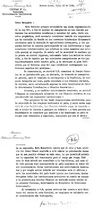 В 1938 году правительством Аргентины была выпущена Директива (циркуляр) № 11 об ограничении въезда в страну европейских беженцев-евреев, бежавших от преследования Третьего рейха[6]. Выражая таким образом антисемитизм, Буэнос-Айрес следовал в фарватере проводимой Берлином политики.