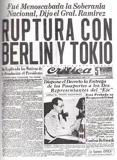 26 января 1944 правительство Аргентины под сильным международным давлением было вынуждено разорвать отношения со странами Оси[38][39][40]. Официальным поводом к разрыву послужило обнаружение в стране разветвлённой сети немецкой разведки[41]. Её вскрытию способствовали не только действия аргентинской полиции, но и разведслужбы США и Британии. В 1944-45 гг. США, Великобритания и почти все латиноамериканские государства отозвали из Буэнос-Айреса своих послов[40][41]. Находясь в условиях международной изоляции, в самом конце войны правительство в Каса-Росада вынуждено было поменять свои взгляды и 27 марта 1945 страна объявила войну Германии и Японии[42][43][22]. Несмотря на это, Аргентина так и не послала на фронт ни одного солдата, хотя и отправляла весной-летом 1945 свои крейсера «Альмиранте Браун» и «Вейнтисинко де Майо» и другие корабли на поиск немецких подводных лодок, остававшихся в Южной Атлантике после капитуляции Берлина[44].