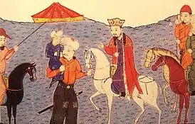 ![]() Аргун с малолетним Газаном на руках — миниатюра из Джами ат-таварих Рашид ад-Дина, XIV век | |