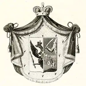 Описание герба: Выдержка из Общего гербовника Щит разделён перпендикулярно на две половины, из коих в левой находится прежний Князей Аргутинских-Долгоруких Герб, то есть: в красном поле выходящая из облака рука в серебряных латах с мечом, и под оною в голубом поле стоящий на земле лев держит передними лапами золотую булаву и щит. В правой половине, по случаю утверждения рода Князей Аргутинских-Долгоруких в Княжеском достоинстве Российской Империи, прибавлен в золотом поле вылетающий чёрный Орёл, имеющий на главе Корону и в лапе скипетр, у которого орла на груди изображён крест Державного Ордена Святого Иоанна Иерусалимского с маленьким на средине щитком красного цвета, на коем означено имя ЕГО ВЕЛИЧЕСТВА ГОСУДАРЯ ИМПЕРАТОРА ПАВЛА I-го. Щит покрыт мантиею и шапкою, принадлежащими Княжескому достоинству |