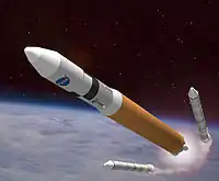 Два твердотопливных ускорителя первой ступени крепятся с двух сторон к центральному блоку первой ступени. Центральный блок первой ступени ракеты разрабатывался по аналогии со ступенью ракеты-носителя Сатурн-5. Двигатель RS-68 разработан фирмой Рокетдайн для тяжёлой ракеты-носителя «Дельта IV».