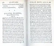 Арете́й из Каппадо́кии (др.-греч. Ἀρεταῖος ὁ Καππαδόκης; вторая половина I века, вероятно, Каппадокия, — первая половина II века, Александрия) — выдающийся древнеримский античный медик и философ, чьи труды сохранились до настоящего времени. Известен в первую очередь трудами по психиатрии, эндокринологии и другим областям медицины: первым обратил внимание на переход меланхолии в манию, что расценивается как первое в истории психиатрии указание на БАР (биполярное аффективное расстройство)[2], описал все известные тогда психические болезни; укоренил в клинике термин «диабет»[3]; первым описал с клинической точки зрения обморок[4][5] и целиакию; дал ценные указания на анатомию, физиологию и клинику паралича.
