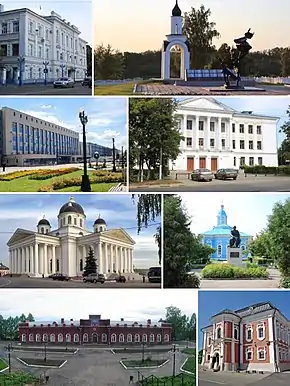 ![]() Против часовой стрелки, начиная с верхнего правого угла: Мемориал погибшим 4 июня 1988 года, Администрация, приборостроительный завод, Воскресенский собор, вокзал Арзамас I, Музей Патриаршества, Знаменская церковь и памятник Ступину, Театр драмы | |||||