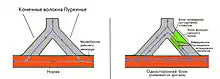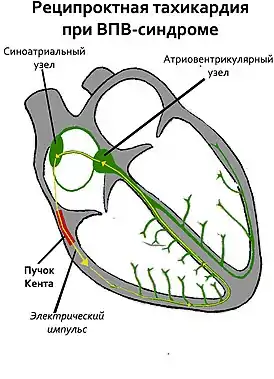 - механизм повторного обратного входа импульса (re-entry): macro-re-entry (циркуляция вокруг полых вен, при синдроме Вольфа-Паркинсона-Уайта: из предсердий через пучок Кента в миокард желудочков, затем через волокна Пуркинье, ножки и ствол пучка Гиса в атриовентрикулярный узел — обратно в предсердия; рис. 1); micro-re-entry[прим. 1] (при дистрофических и некротических изменениях возникает неполный однонаправленный блок проведения возбуждения к миофибрилле рабочего миокарда предсердий или желудочков. Но в этом же месте сохраняется способность антидромного проведения импульса. Если импульс зацикливается один-два раза — возникает экстрасистолия, если три и более — пароксизмальная тахикардия; рис 2.)