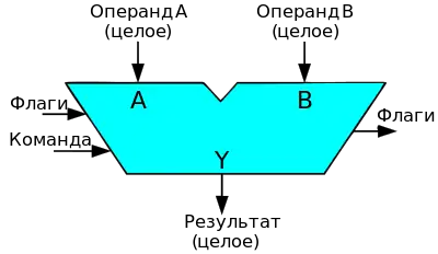 По своим функциям арифметико-логическое устройство является операционным блоком, выполняющим микрооперации, обеспечивающие приём из других устройств (например, памяти) операндов, их преобразование и выдачу результатов преобразования в другие устройства. Арифметико-логическое устройство управляется управляющим блоком, генерирующим управляющие сигналы, инициирующие выполнение в АЛУ определённых микроопераций. Генерируемая управляющим блоком последовательность сигналов определяется кодом операции команды и оповещающими сигналами.