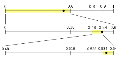 Предположим, что нам необходимо раскодировать сообщение методом арифметического кодирования согласно описанной выше модели. Сообщение в закодированном виде представлено дробным значением 0,538 (для простоты используется десятичное представление дроби, вместо двоичного основания). Предполагается, что закодированное сообщение содержит ровно столько знаков в рассматриваемом числе, сколько необходимо для однозначного восстановления первоначальных данных.