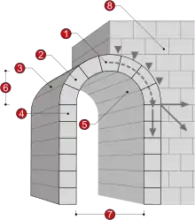 1. Замковый камень 2. Клинчатый камень (вуссуар) 3. Внешняя поверхность свода (экстрадос) 4. Пятовый камень (импост) 5. Внутренний свод (интрадос) 6. Стрела подъёма 7. Пролёт 8. Опорная стена