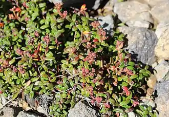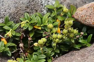 ![]() Растительное сообщество вересковых на горе Хакусан (Хонсю, Япония): арктерика низкая с плодами (внизу слева); Кассиопея плауновидная (Cassiope lycopodioides) (вверху справа) — активно цветущее растение с плауновидными побегами; Филлодоце ниппонская (Phyllodoce nipponica) — растение с побегами, похожими на ёлочки |