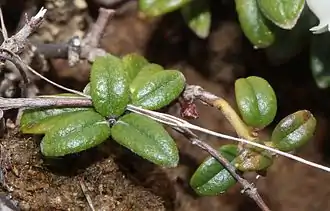Низкорослые вечнозелёные стелющиеся кустарнички с длинными корнями, многочисленными подземными столонами и короткими надземными ветвями. Высота взрослых растений составляет обычно около 10 см, реже — до 15 см[2]. По внешнему виду (без плодов) растение похоже на бруснику (Vaccinium vitis-idaea), только с более мелкими листьями[4].