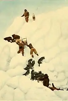 | Роберт Пири официально считается первым человеком, достигшим Северного полюса после перехода на собачьих упряжках по паковым льдам | |