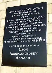 Арманд, Неон Александрович (1 января 1932 года, Москва — 9 октября 2009) — советский учёный в области радиофизики, внесший значительный вклад в исследования распространения радиоволн в атмосфере Земли, в атмосферах Венеры и Марса, и в межпланетном пространстве. Доктор технических наук, профессор.
