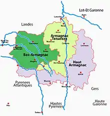 В 1909 году были выделены три зоны для производства арманьяка: Бас-Арманьяк (англ. Bas-Armagnac) — 57 % всего выпускаемого арманьяка; Арманьяк-Тенарез (англ. Armagnac-Ténarèze); О-Арманьяк (англ. Haut-Armagnac)