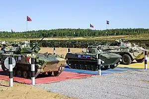 - Десантный взвод: среди подразделений воздушно-десантных войск (аналогичных по предназначению подразделений); состав команды до 42 человек, из которых 3 отделения по 7 человек являются основным конкурсным составом, еще одно отделение является запасным, а еще тринадцать человек — это руководство и технический состав[24]. Соревнование включает в себя 4 этапа, каждый из которых разбит на несколько подэтапов, так что общее число конкурсов составляет десять[24]. В ходе соревнований оценивается как непосредственно десантная работа, так и навыки стрельбы и владение бронетранспортной техникой[24].