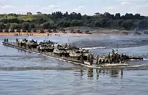- Открытая вода: конкурс среди понтонно-переправочных подразделений; состав команды — 105 человек, в которые входят понтонная рота, инженеры сапёрного отделения, экипажи различной сопутствующей техники, а также командный состав, тренерская группа и обеспечивающий персонал[29]. Соревнование включает в себя 7 этапов, в ходе которых проводится инженерная разведка водой преграды, оборудование перехода через противотанковый ров, организация десантной переправы, оборудование высокотоннажного парома для тяжёлой техники и боеприпасов, переправка гусеничной техники ротными паромами[29]. В рамках конкурсов используются следующие виды техники: ПМП, ПТС, ПММ, СНЛ, путепрокладчик БАТ[29].