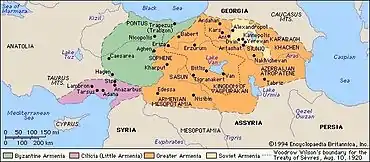 - Encyclopaedia of Islam. — Leiden: E.J. Brill, 1986. — Т. 1. — С. 635.Оригинальный текст (англ.)[показатьскрыть]When Antiochus III was defeated by the Romans at Magnesia (189 B.C.), the two "strategi" who governed Armenia made themselves independent, took the title of king and formed two kingdoms, the one, Artaxias, in Great Armenia or Armenia proper and the other, Zariadris, in Little Armenia (Sophene-Arzanene). Great Armenia fell afterwards under the suzerainty of the Arsacids. In the first century B.C. a descendant of Artaxias, Tigranes the Great, threw off the Parthian yoke, dethroned the king of Sophene and united all Armenia under his sceptre; having achieved Armenian unity, he established at the expense of the Parthians and the Seleucids a vast Armenian empire and played an important political role.