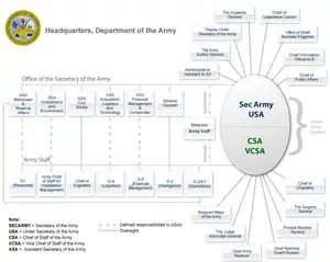 Военный аппарат министерства Армии возглавляет Начальник штаба Армии США, который осуществляет общее военное руководство Армией США. Он входит в состав Объединённого комитета начальников штабов (ОКНШ) и осуществляет непосредственное руководство аппаратом штабных и военно-административных служб департамента СВ.[14][15] Закон Голдуотера — Николса (от 1986 г.) исключает как руководство (ОКНШ), так и министров (главкомов) видов вооружённых сил из командной иерархии, передавая непосредственное управление войсками на ТВД президенту, которому через министерство обороны напрямую подчинены начальники региональных объединённых командований на ТВД.