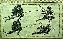 Из сохранившихся списков инвентаря в Ганьсу и Синьцзяне ясно, что Хань очень любила арбалеты. Например, в одной партии бумаг только два упоминания луков и тридцать упоминаний арбалетов.[25] Арбалеты производились серийно из тутового дереа и латуни; оружие 1068 года выпуска со 140 шагов пробивало дерево.[26] Во времена Цинь использовалось до 50 тыс. арбалетов, при Хань их число выросло до нескольких сотен тысяч.[27] Согласно одному историку Дэвиду Графу, ко II веку до н. э. арбалет стал «не чем иным, как стандартным оружием ханьских армий».[28]Чтобы получить квалификацию арбалетчика, солдаты должны были тянуть арбалет «начального уровня» с натяжным весом 76 кг.[29] Каменные резные изображения и картины эпохи Хань также содержат изображения всадников, вооруженных арбалетом.