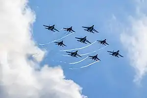 Кроме выступления на аэродроме Кубинка, пилотажные группы принимают участие в динамическом показе на полигоне Алабино.