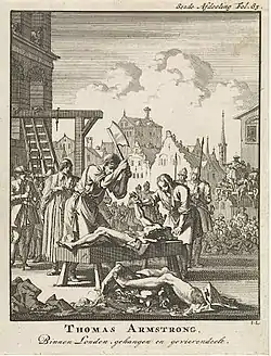 В 1684 году Армстронг был обвинён в государственной измене и приговорён к повешению, потрошению и четвертованию за участие в амбарном заговоре (1683), имевшем целью устранить короля Карла II. 20 июня 1684 года приговор был приведён в исполнение. Голову Армстронга водрузили на кол в Вестминстере, 3/4 его тела были показаны в Лондоне, а 1/4 — в Стаффорде.
