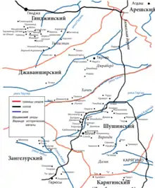 - Нагорный Карабах — большая часть Шушинского уезда и горные районы Елизаветпольского, Джеванширского и Джебраильского уездов;