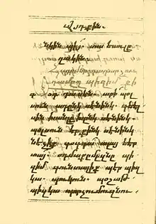 Письмо армянское: болоргир — «круглое» письмо с использованием круглых прописных букв и наклонных строчных букв, выполненных прямыми горизонтальными и вертикальными элементами; и преимущественно нотргир — наклонное скорописное письмо с использованием закругленных элементов.