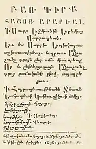 - Franz Josef Hausmann. Wörterbücher: ein internationales Handbuch zur Lexikographie. — Walter de Gruyter, 1991. — С. 2368.Оригинальный текст (англ.)[показатьскрыть]The first printed dictionaries relating to Armenian were the Armenian-Latin dictionaries compiled in Europe by F. Rivola (1621, 1633) and C. Galanus (1645). In the second half of the 17th century, printed dictionaries compiled by Armenians appeared. The Bible, published in 1666 had as its appendix a concordance compiled by Oskan Erevantsi. In 1635 a Latin-Armenian dictionary by A. Nersesovich was published. The first Armenian explanatory dictionary, published in 1698 by Eremia Meghretsi (8500 entries), was compiled on basis of medieval manuscript dictionaries, retaining their merits and demerits.