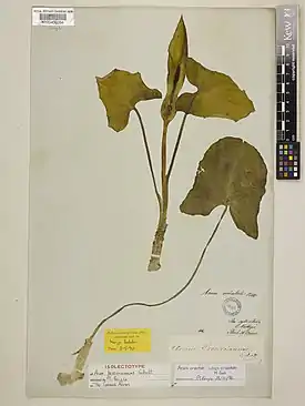 Листья прикорневые, имеют черешок различной длины, достигая максимальной высоты 25 см. Листья растения имеют сердцевидно-копьевидную форму. Передняя лопасть имеет заострённую форму длиною около 7 см, боковые лопасти в два раза короче, менее острые и отогнуты кзади. Чешуевидные влагалища у основания покрывают листья.