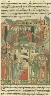 ![]() Фрагмент стенной росписи из Троицкого собора Макарьева Калязина монастыря, 1654 год | |