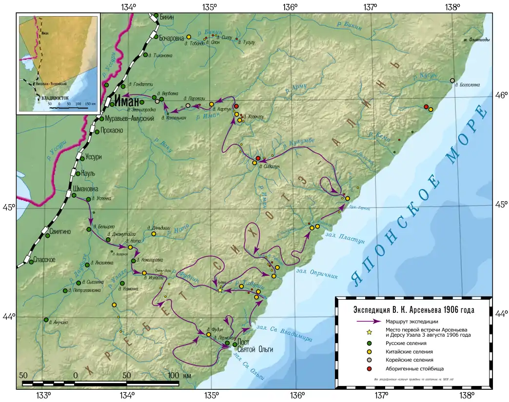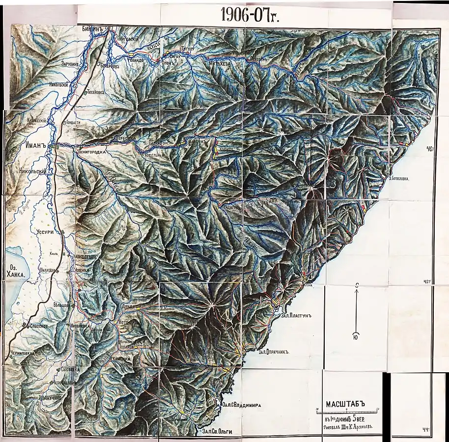 Доклад, сделанный Арсеньевым в зале Общественного собрания, был встречен стоячей овацией. Публика была восхищена мужеством оказавшихся на краю гибели путешественников. 28 января (10 февраля) 1909 года Арсеньева избрали действительным членом Императорского Русского Географического Общества. Рекомендации ему дали секретарь ИРГО А. А. Достоевский и действительный член этого общества ротмистр А. Н. Гудзенко[84]. В Хабаровске Арсеньев сдал в Переселенческое управление предварительный колонизационный отчёт экспедиции[85]. После недолгого отдыха дома он вернулся к своему отряду, стоявшему лагерем у озера Синда, и 16 февраля (1 марта) 1909 года экспедиция продолжила работу. Спустившись вниз по течению Амура к устью реки Анюй, отряд пошёл по рекам Пихца и Тормасуни. Достигнув хребта Сихотэ-Алинь, экспедиция перебралась через него и вышла к реке Икбу, и затем к реке Коппи[86].