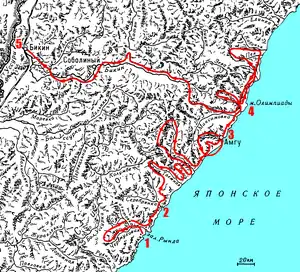 В конце августа экспедиция вышла к морю, и вскоре добралась до Императорской гавани. После двух недель отдыха участники экспедиции оправились от 21-дневной голодовки, и 14 (27) сентября покинули Императорскую гавань, отправившись на юг. В устье Самарги, куда экспедиция добралась 28 октября (10 ноября), пришлось целый месяц ждать штабс-капитана Николаева, который должен был доставить новое снаряжение. Дальнейший путь по зимней тайге экспедиция проделала на нартах, в которые было запряжено несколько собак. Встретив новый 1909 год в устье реки Буй, отряд перевалил через Сихотэ-Алинь и, без происшествий пройдя сквозь тайгу, вышел к Амуру. Экспедиция разбила лагерь в 128 километрах от Хабаровска. Арсеньев отправился в город, чтобы доложить о результатах экспедиции[83].