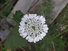Цветки собраны в сложные зонтики диаметром до десяти сантиметров, которые состоят из простых зонтиков. Венчики белые. Наружные лепестки краевых цветков в несколько раз увеличены. Центральные цветки — тычиночные. Цветение — в марте-мае.