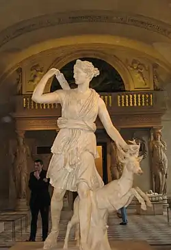 - Изображалась с золотым луком и колчаном за плечами, с копьём в руках, иногда с полумесяцем на голове (символ богини Луны), часто в сопровождении лани и нимф[70][71]. Традиционно богиню, символизировавшую целомудрие, «одевали» в короткий хитон. Позднее, в XVI—XIX веках, стали появляться изображения нагой богини, что в то время приводило к настоящим скандалам (например Диана-охотница, созданная в 1790 Гудоном).