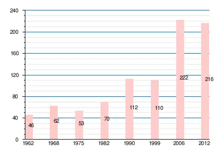 | 1962 | 1968 | 1975 | 1982 | 1990 | 1999 | 2004 | 2006 | 2009 | 2011 | 2012 |