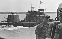 - Monitor (MON) (монитор) — речной монитор «MON» (прозвище «Майк») создан в 1966 году на базе десантного катера времен Второй мировой войны типа «LСM-6» для боевых действий во Вьетнаме. Аппарель десантного катера убиралась и вместо неё оборудовалась остроконечная носовая часть, перед корпуса закрывался бронепалубой, на которой размещалась башня Mk 52 с 40-мм автоматической пушкой M1 (модернизированная шведская пушка «Бофорс») и 12,7-мм пулемётом M2. На ходовой рубке монитора дополнительно устанавливали три башни с 20-мм пушкой Мк.16 и 12,7-мм пулемётами. Кроме того, в трюме между носовой башней и рубкой устанавливали 81-мм миномёт М2, а на бортовых шкворневых установках — два пулемета М60.[27] Штатное вооружение экипажа было усилено 3 гранатомётами «М79». В 1968 году вооружение мониторов было усилено путём установки 105-мм гаубицы «М49» в башне «T172» вместо 40-мм пушки. Водоизмещение монитора составило 83 тонны. Также некоторые мониторы стали огнемётными (прозвище «Зиппо»), на них устанавливались две башни «M8» с огнемётами «Mi 0-8» взамен обычного вооружения, при этом на крыше рубки оставляли одну пулемётную башню. Все мониторы оснащались решётками для защиты от РПГ.