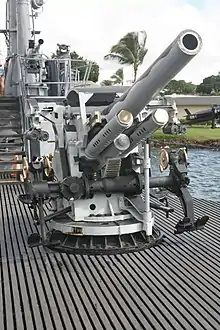 Также артиллерия подлодок предполагалась для самообороны в крайнем случае невозможности погружения как против кораблей, так и против самолётов. В целом подлодка считалась заведомо более слабой в артиллерийском бою с надводным военным кораблём равного класса, хотя и были единичные случаи успешных артиллерийских боёв (например, случай с итальянской подлодкой «Торричелли» в Красном море).
