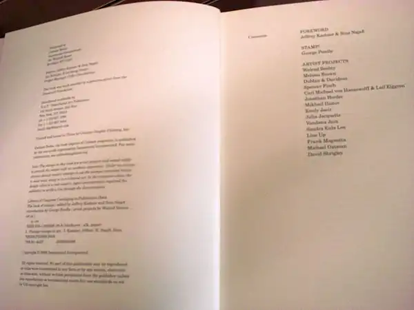 Выходные сведения (слева) и перечень представленных в книге авторов и их проектов артимарок (справа)[4]