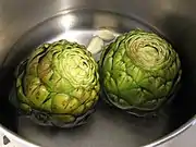 Слева направо: Собранный артишок. Артишок, подготовленный для приготовления. Пакетик артишокового чая. | ||||||||||