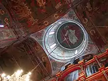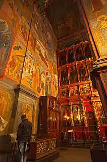 Более шестидесяти портретов русских князей расположены на столпах и в первом ярусе. Среди них Иван Калита, Василий III, Дмитрий Донской и другие[27]. В куполах представлены лики пророков, праотцев, на сводах — сюжеты из Нового Завета. В центральном барабане изображены фигуры Адама и Евы. В западных куполах помещены образы архангелов Михаила и Гавриила, ниже — апостолов, святых угодников, воинов-мучеников и сцены чудес архангела Михаила[37]. Над алтарём находятся композиции Богородичного цикла, в том числе «Успение Богоматери»[38][39]. На южной стене в третьем ярусе помещена композиция «Крушение стен Иерихона». Пять композиций во втором ярусе повествуют об отроке Василии, нашедшем золото[40]. В западной части собора располагается цикл композиций на тему «Символы веры»[41].