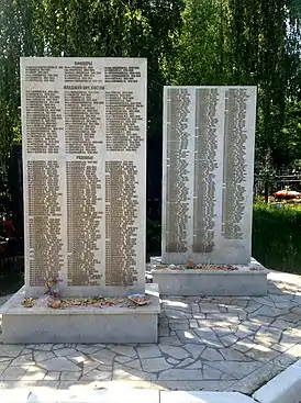 Рядом со скульптурой солдата установлены две стелы, на которых выбит список похороненных на кладбище воинов.