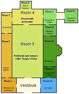 В центральном зале располагались скульптуры восточного и западного фронтонов Храма Зевса и метопы фриза, в также статуи Ники работы древнегреческого скульптора Пеония и Гермеса с младенцем Дионисом работы Праксителя. В остальных залах размещались другие находки: изделия из бронзы и керамики, фрагменты рельефов и скульптур.